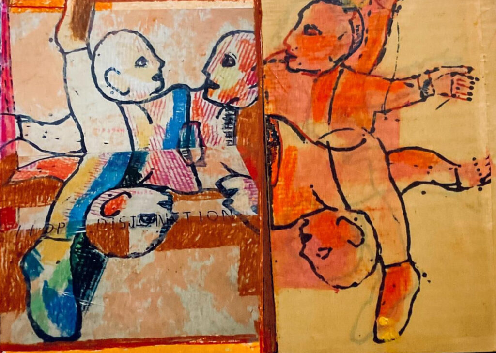 L’exposition Hip Hop Disjonction de Pierre Antoniucci à la galerie Net Plus se présente comme une invitation à la danse et une ode à la vie. Les oeuvres exposées sont des assemblages de toiles peintes au début des années 2000 et d’autres plus récentes qui viennent dialoguer entre elles pour créer un récit nouveau. Au travers de ses compositions appelées JAB, l’artiste explore ses créations antérieures et leur apporte une nouvelle signification grâce à cette disposition originale.Pierre Antoniucci peint sur des grands cartons en nid d’abeille, ce qui souligne son intérêt pour l’exploration des matières. La création ne réside pas simplement dans les coups de pinceaux, mais également dans l’expérimentation avec différents médiums.